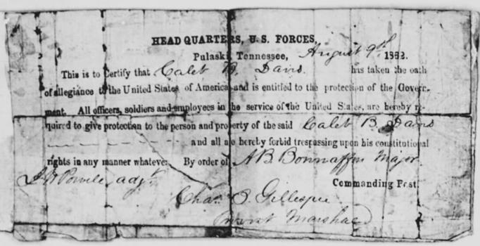 This torn and tattered page is a copy of Caleb Davis’s original Oath of Allegiance to the Union, as sworn before Union officers in Pulaski on August 9, 1862. Source: Caleb B. Davis Southern Claims Commission file.