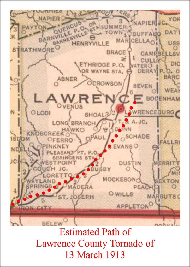 On March 13, 1913, as the polls remained open in Lawrenceburg, a damaging tornado cut a swath from one end of Lawrence County to the other between 4:00 and 5:00 p.m. The Lawrence ‘Democrat’ describes its path as entering the county west of Iron City, then passing east of Loretto, striking Springer Station, and doing “a great deal of damage” around Leoma, before moving to within a mile and a half east of Lawrenceburg. I have traced the estimated path of the storm on this 1913 map of Lawrence County.