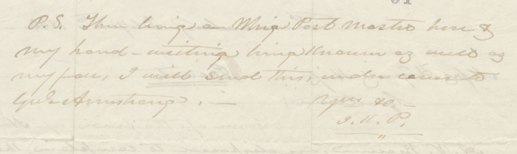 “P.S. There being a Whig Post master here & my hand-writing being known as well as my face, I will send this, under cover to Genl. Armstrong. J.K.P.”