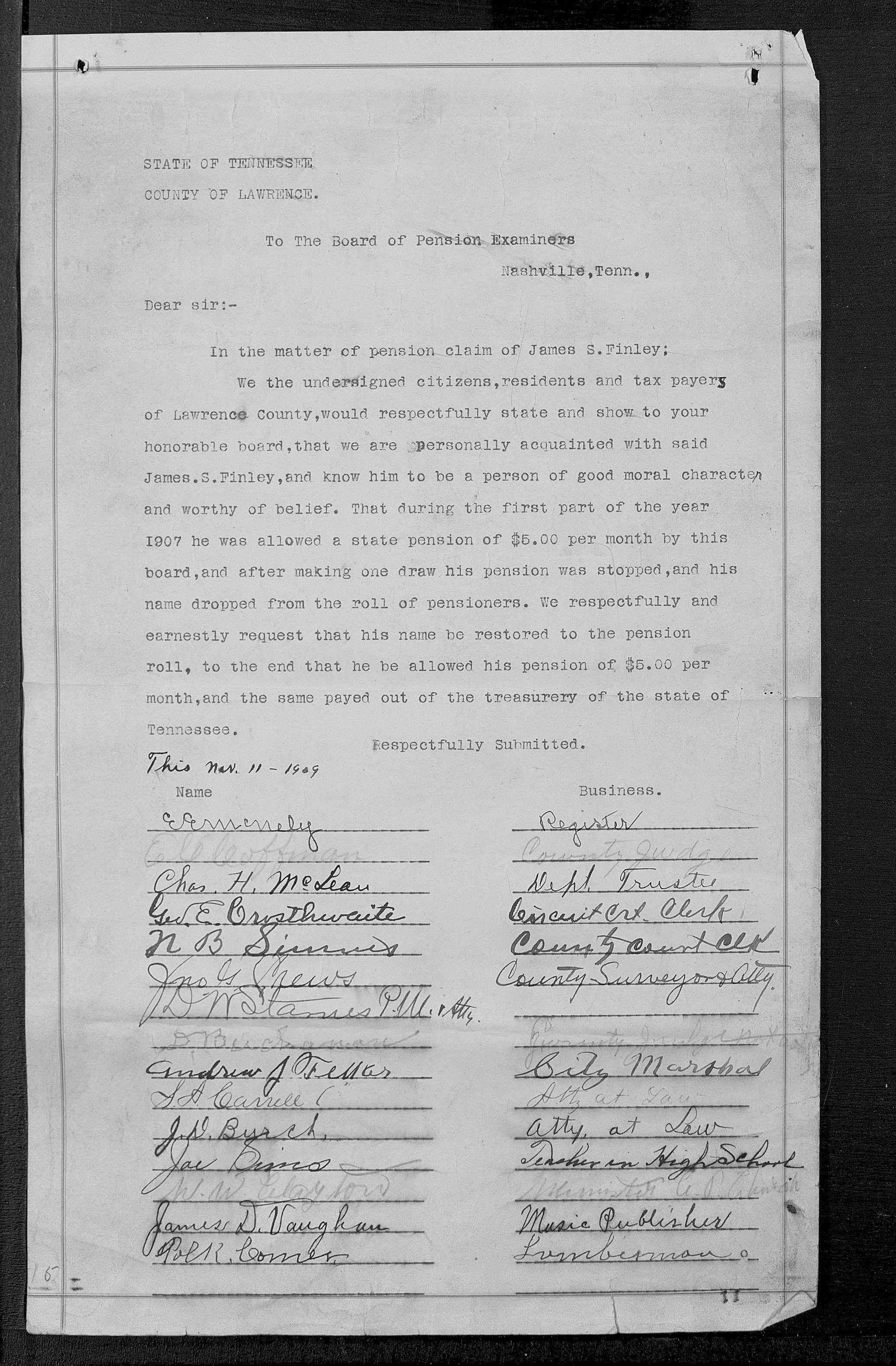 Finley’s account and his extant service record satisfied the Tennessee Board of Pension Examiners, and he was allowed to draw his $5 per month–once. After one check, Finley’s pension stopped and he was given no reason why.