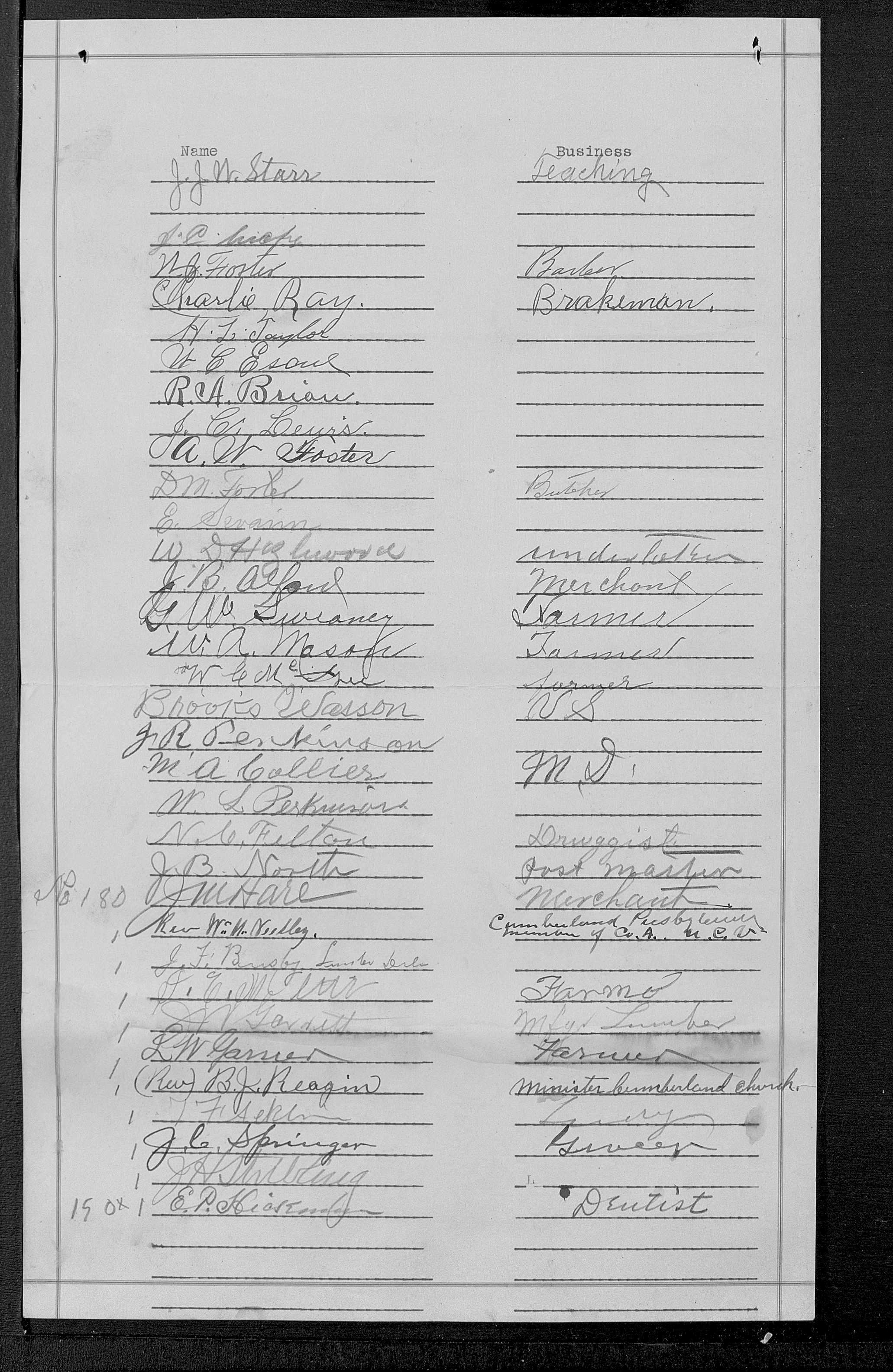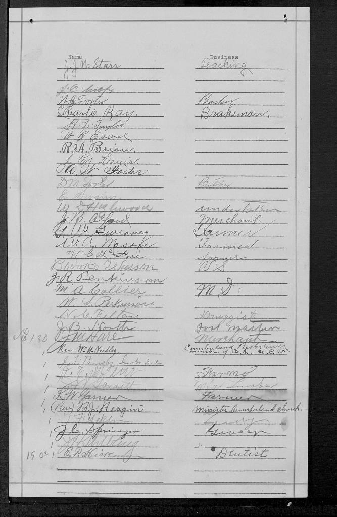 The petition, seen here, is impressive. It contains 190 names of men from a variety of walks of life. James D. Vaughan, the father of Southern Gospel music, signed it, as did the mayor, a doctor, a dentist, multiple pastors, several Civil War veterans of both sides, as well as butchers, merchants, painters, carpenters, harness makers, brakemen, newspaper editors, bakers, and the city marshal.